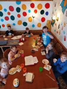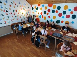 Zuerst haben wir in einem Tischgebet dem „lieben Gott“ für alles gedankt und danach haben wir in einer gemütlichen Runde unser Selbstgebackenes mit Butter und Aufstrich verspeist.
