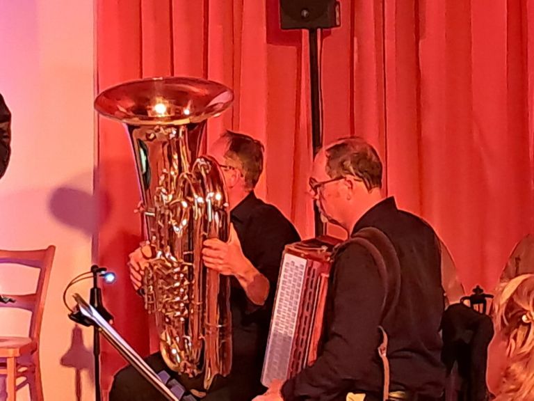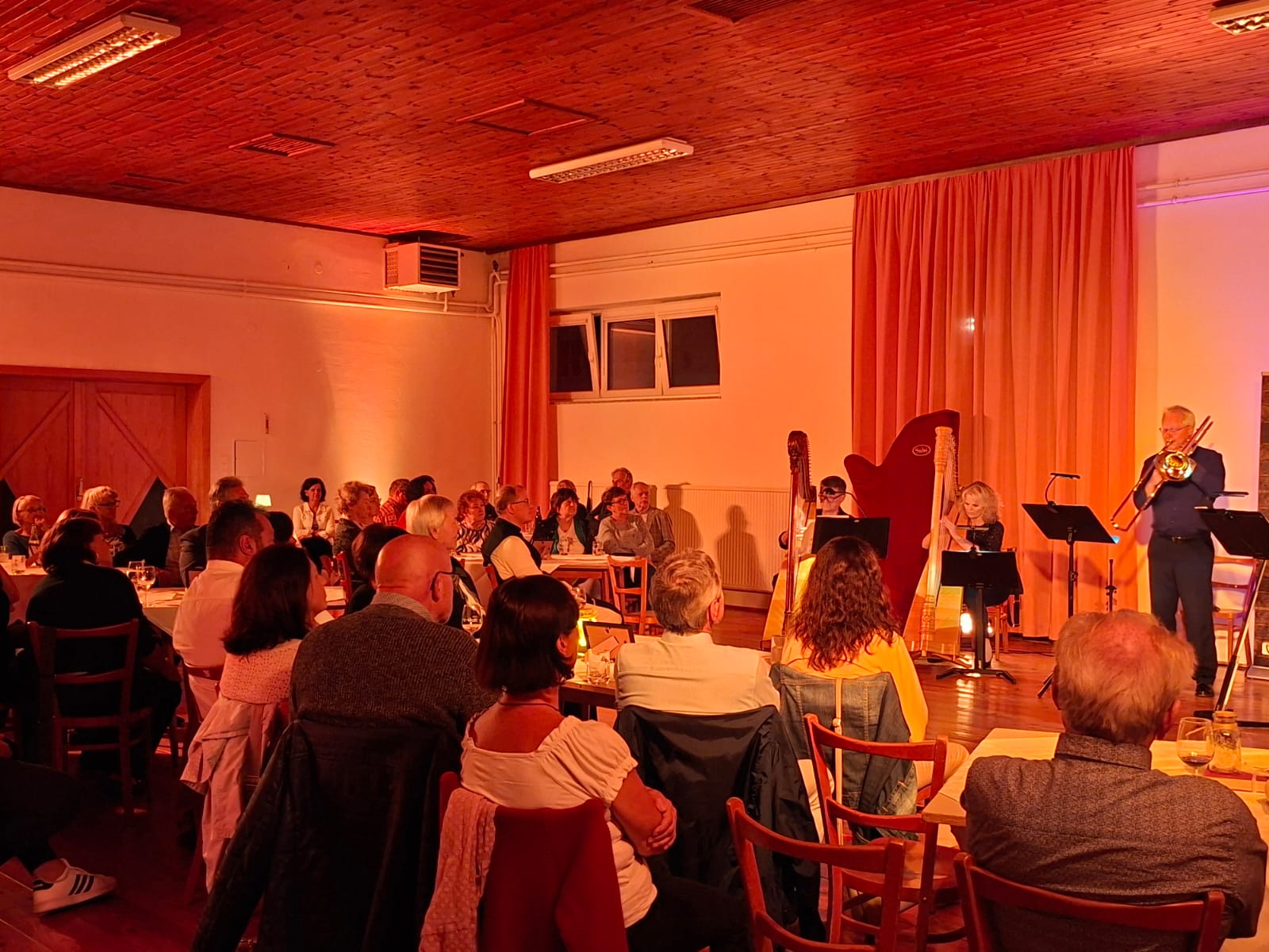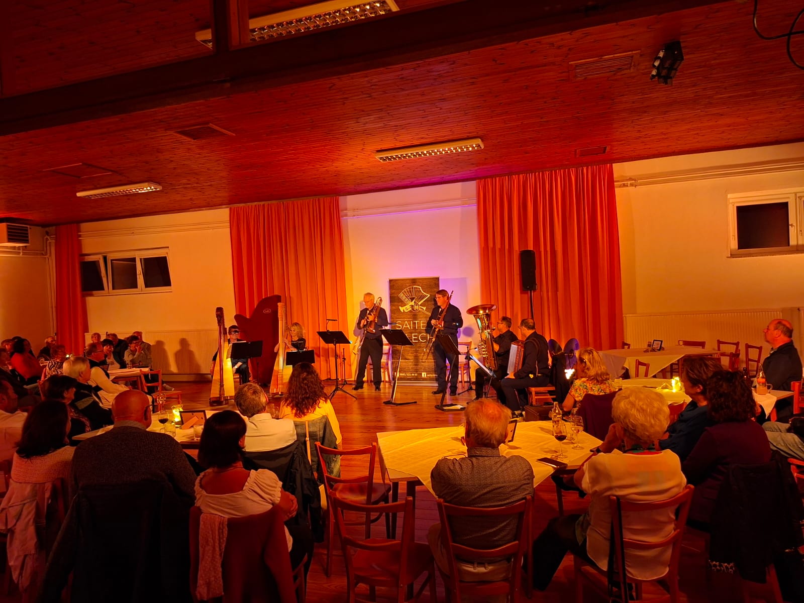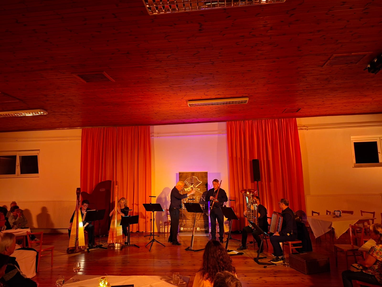 Am vergangenen Freitag (5. September) war im stimmungsvoll beleuchteten Pfarrsaal das Ensemble „Saitenblech“ zu hören. Ursprünglich als Konzert unter dem Nussbaum im Pfarrhof geplant, mussten wir aufgrund des Wetters umdisponieren; ein echter Wermutstropfen. Doch dann zeigte sich zum Glück, dass der Pfarrsaal mit entsprechenden Lichtinstallationen zu einem richtig schönen Raum werden kann, der darüber hinaus auch eine gute Akkustik bietet. Wir danken Martin für die tolle Beleuchtung!