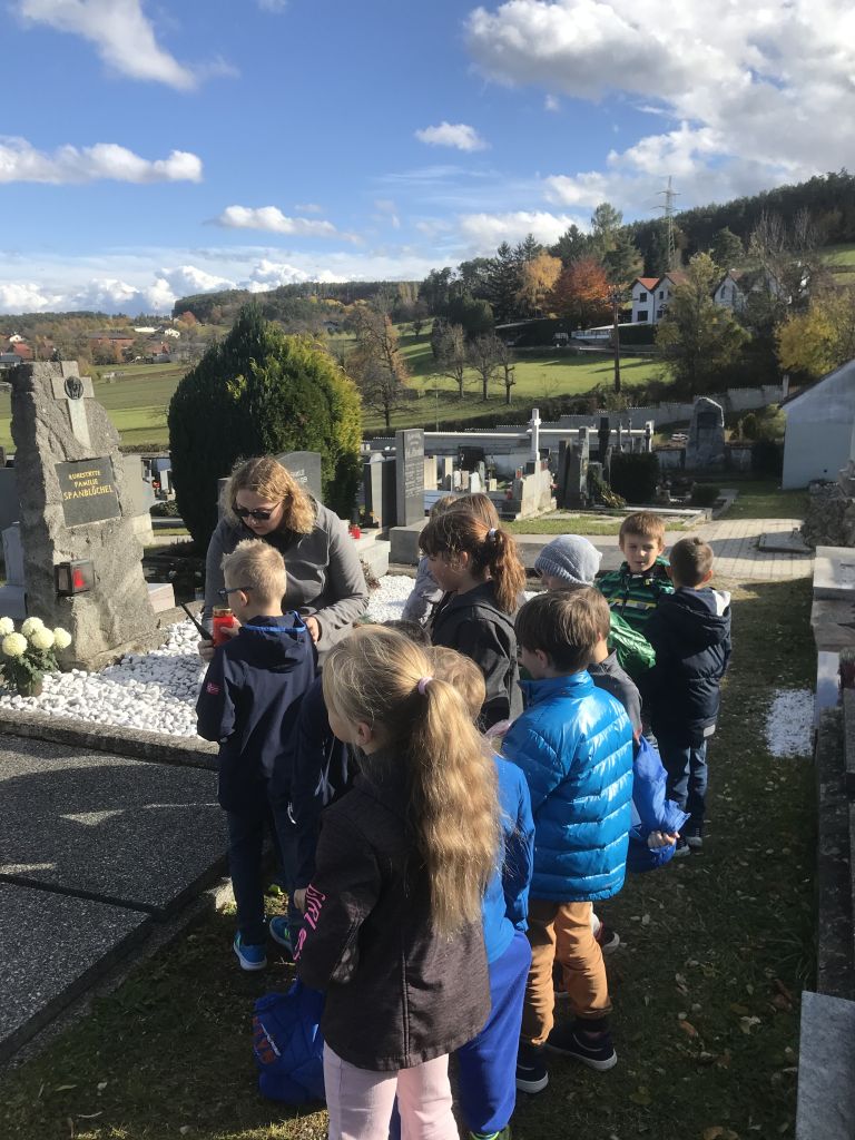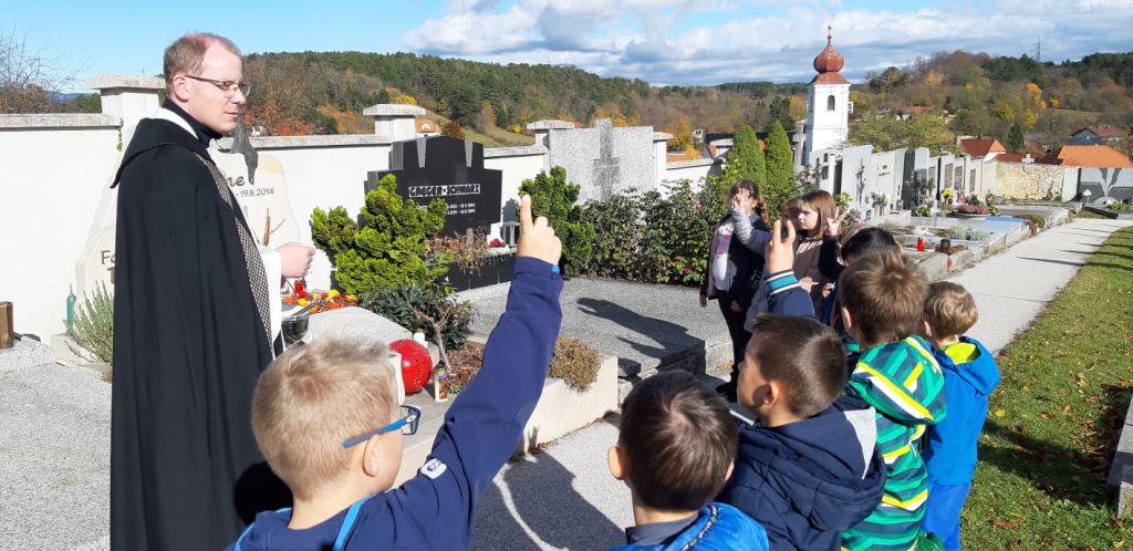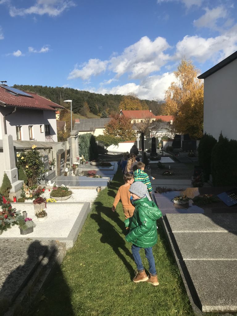 Unsere erste Einheit als Vorbereitung auf die Erstkommunion hatten wir auf dem Friedhof. Die christliche Botschaft lautet: Das Leben geht über den Tod hinaus. Wir glauben an die Auferstehung der Toten. Viele Kinder haben ein Familiengrab auf unserem Friedhof…