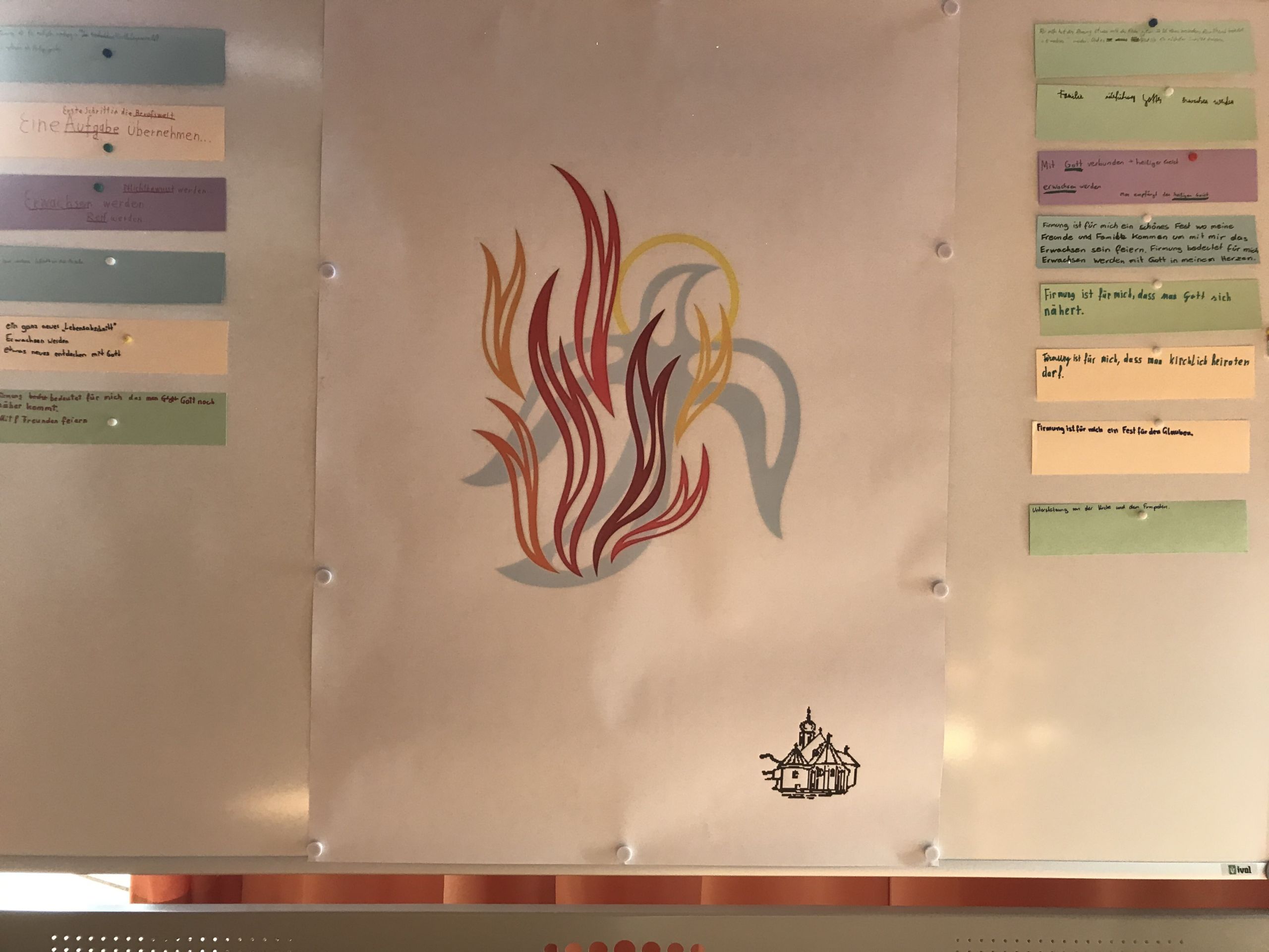Unser Motto für die Firmung: Das Feuer und der Geist: „Als der Pfingsttag gekommen war, befanden sich alle am gleichen Ort. Da kam plötzlich vom Himmel her ein Brausen, wie wenn ein heftiger Sturm dahinfährt, und erfüllte das ganze Haus, in dem sie waren. Und es erschienen ihnen Zungen wie von Feuer, die sich verteilten; auf jeden von ihnen ließ sich eine nieder. Alle wurden mit dem Heiligen Geist erfüllt… Als die Apostel in Jerusalem hörten, dass Samarien das Wort Gottes angenommen hatte, schickten sie Petrus und Johannes dorthin. Diese zogen hinab und beteten für sie, sie möchten den Heiligen Geist empfangen. Denn er war noch auf keinen von ihnen herabgekommen; sie waren nur auf den Namen Jesu, des Herrn, getauft. Dann legten sie ihnen die Hände auf und sie empfingen den Heiligen Geist.“ (Apostelgeschichte, Kapitel 2 und 8)