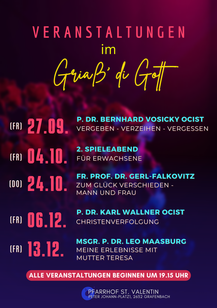 Was tut sich bei uns im „Griaß‘ di Gott“? Es gibt die unterschiedlichsten Zusammentreffen: vom monatlichen Eltern-Kind-Café (1. Mittwoch im Monat ab 7:45 Uhr) über den Bibelabend (jeden 2., 3., 4. Mittwoch im Monat ab 19:15) bis zum sonntäglichen Pfarrcafé nach dem Gottesdienst.